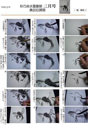 【杉乃会】のお手本は手ほどき次第で誰でも描いていけるものです。新級→中伝→奥伝→遊伝と進んでいきます。又、お手本と作品は分けて考えており、作品における自己表現はまだまだ追及していきます。