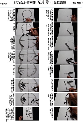 【杉乃会】のお手本は手ほどき次第で誰でも描いていけるものです。新級→中伝→奥伝→遊伝と進んでいきます。又、お手本と作品は分けて考えており、作品における自己表現はまだまだ追及していきます。