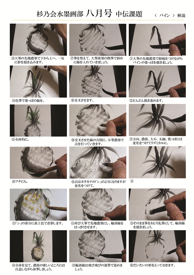 【杉乃会】のお手本は手ほどき次第で誰でも描いていけるものです。新級→中伝→奥伝→遊伝と進んでいきます。又、お手本と作品は分けて考えており、作品における自己表現はまだまだ追及していきます。