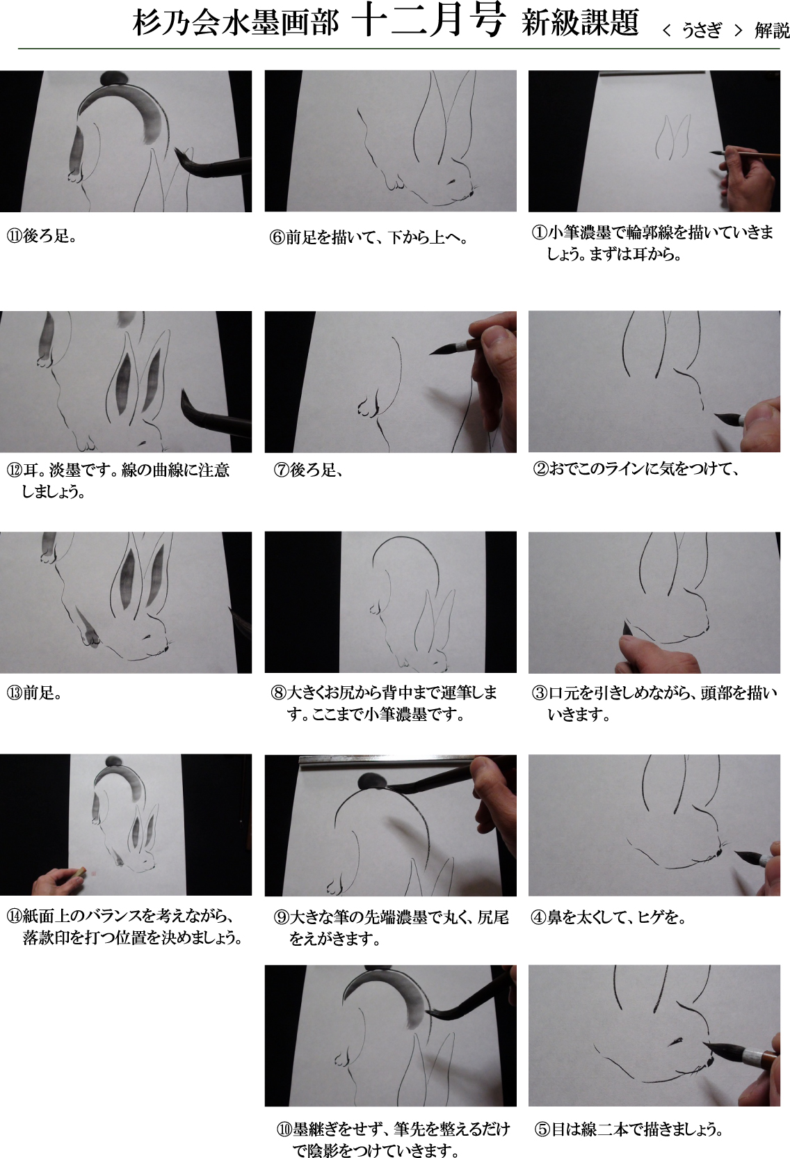 【杉乃会】のお手本は手ほどき次第で誰でも描いていけるものです。新級→中伝→奥伝→遊伝と進んでいきます。又、お手本と作品は分けて考えており、作品における自己表現はまだまだ追及していきます。